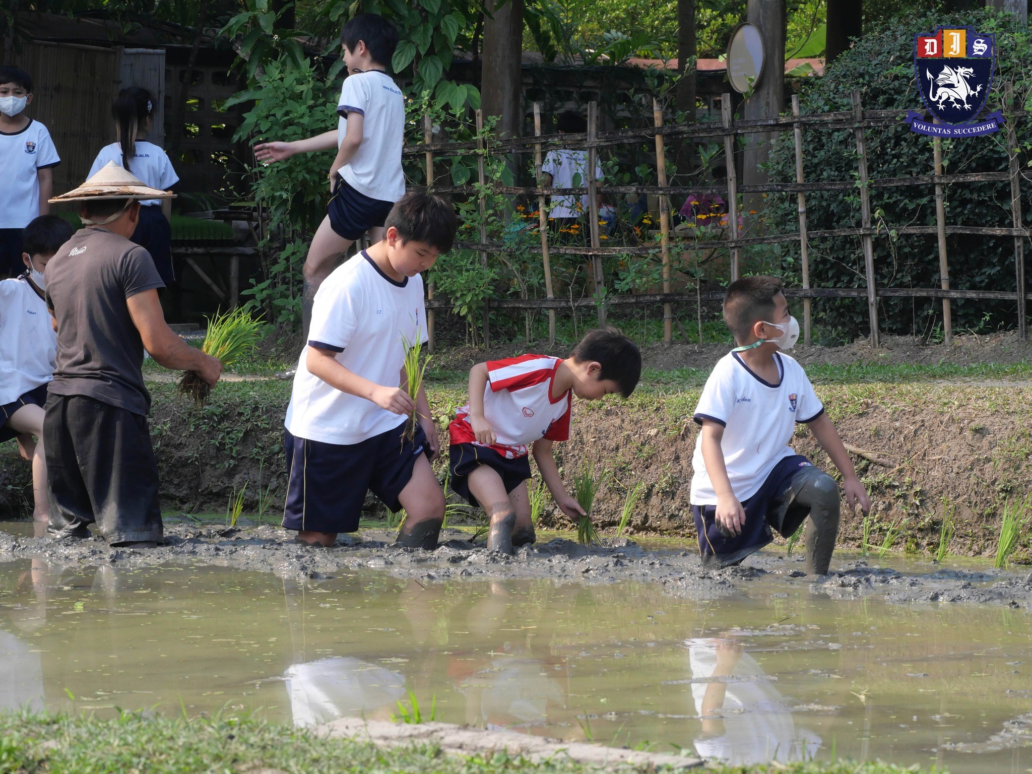 One of the most exciting activities of the day was planting rice in the muddy paddies. With their pant legs rolled up and big smiles on their faces, students eagerly stepped into the cool mud to learn how rice is traditionally grown. Guided by the farm instructors, they carefully planted young rice seedlings row by row.
